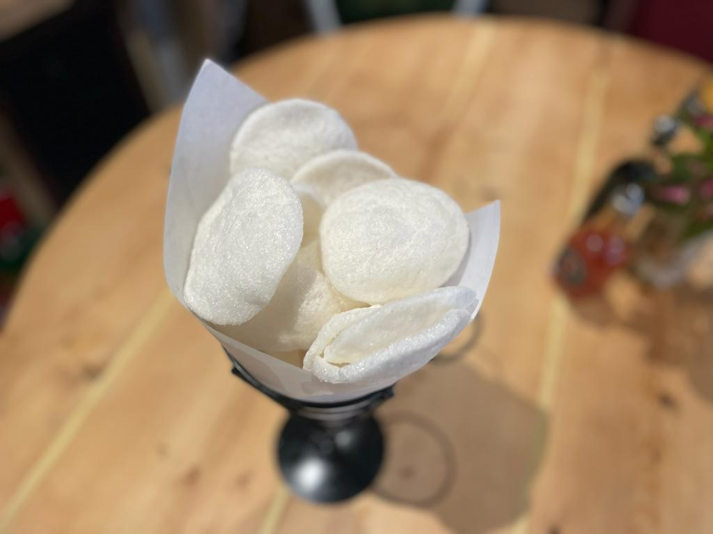 Thin and crispy crackers made from prawn-flavoured starch, a popular and crunchy appetiser.