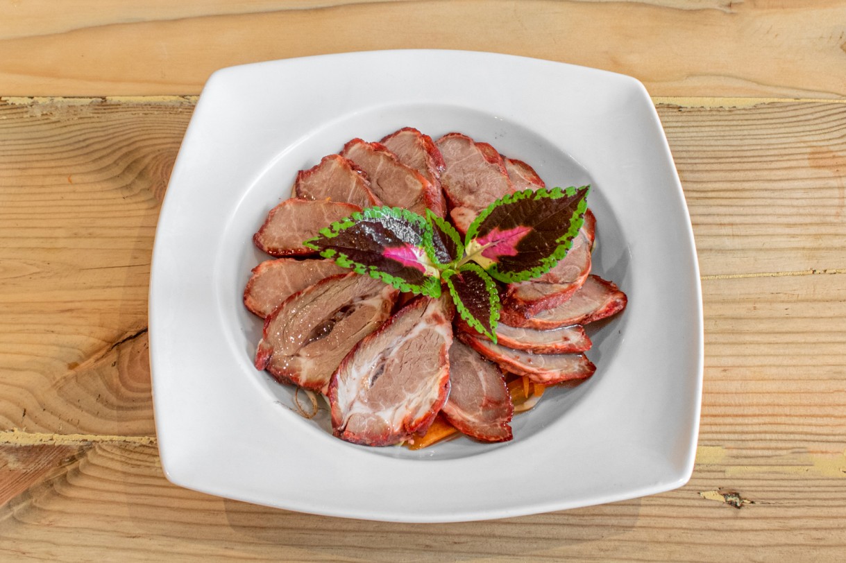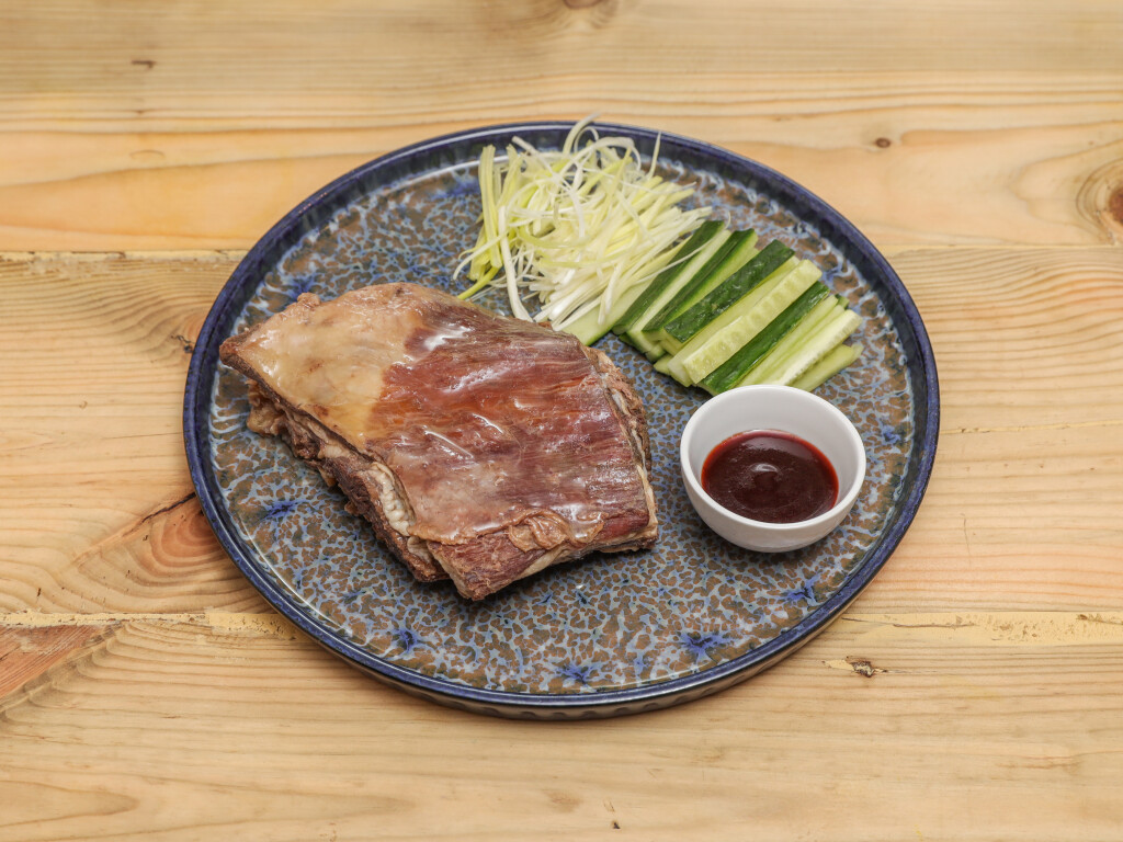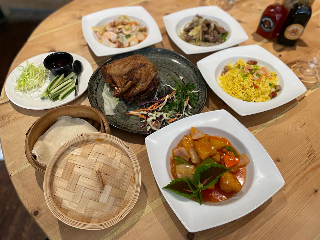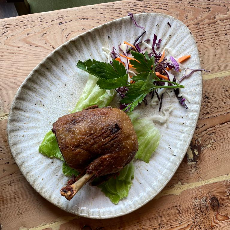 Tender lamb, crisp skin, served with pancakes for a flavourful and satisfying meal.