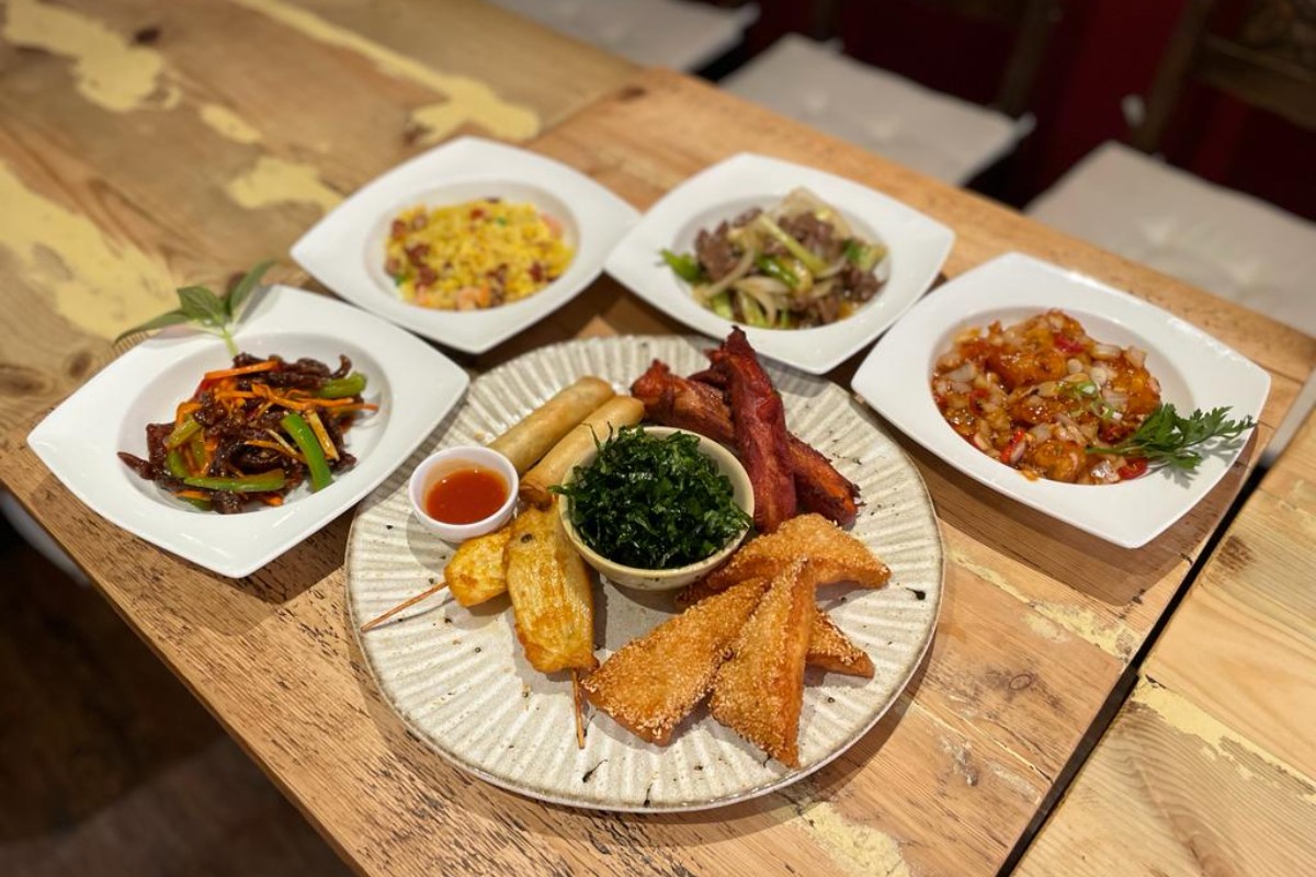 A delightful medley of Chinese appetisers featuring spring rolls, prawn toast, chicken skewers, succulent BBQ ribs, and crispy seaweed for a perfect start to your meal.