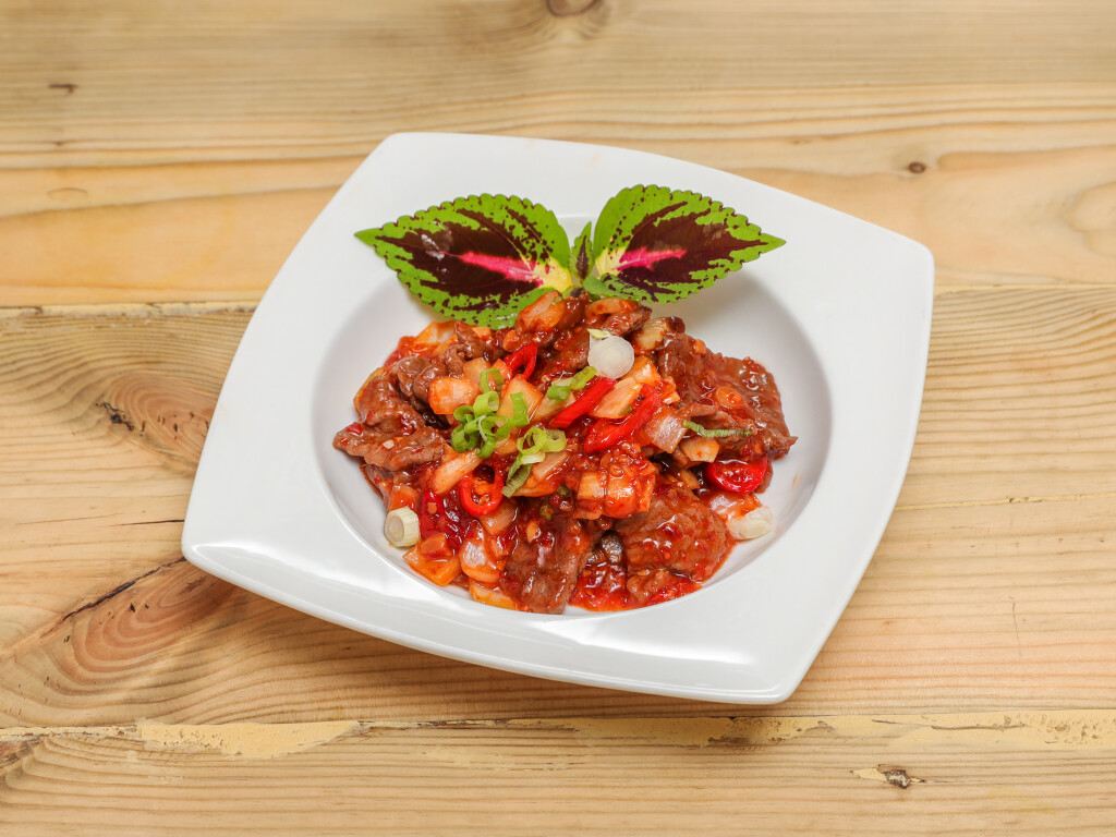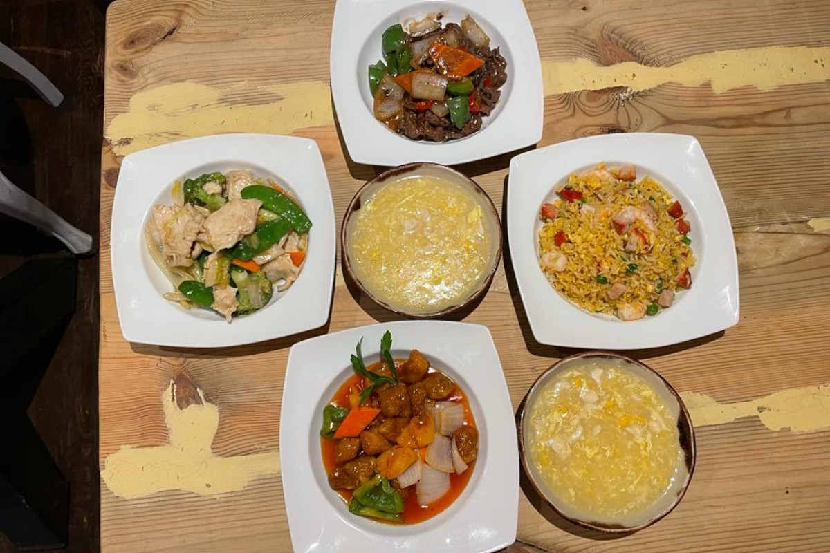 A delightful spread for two or more, featuring chicken sweetcorn soup, sweet and sour pork, beef in black bean sauce, and chicken with seasonal vegetables. Accompanied by Yeung Chow Fried Rice. Plus an extra treat of Spicy Pepper King Prawns for 4 people.