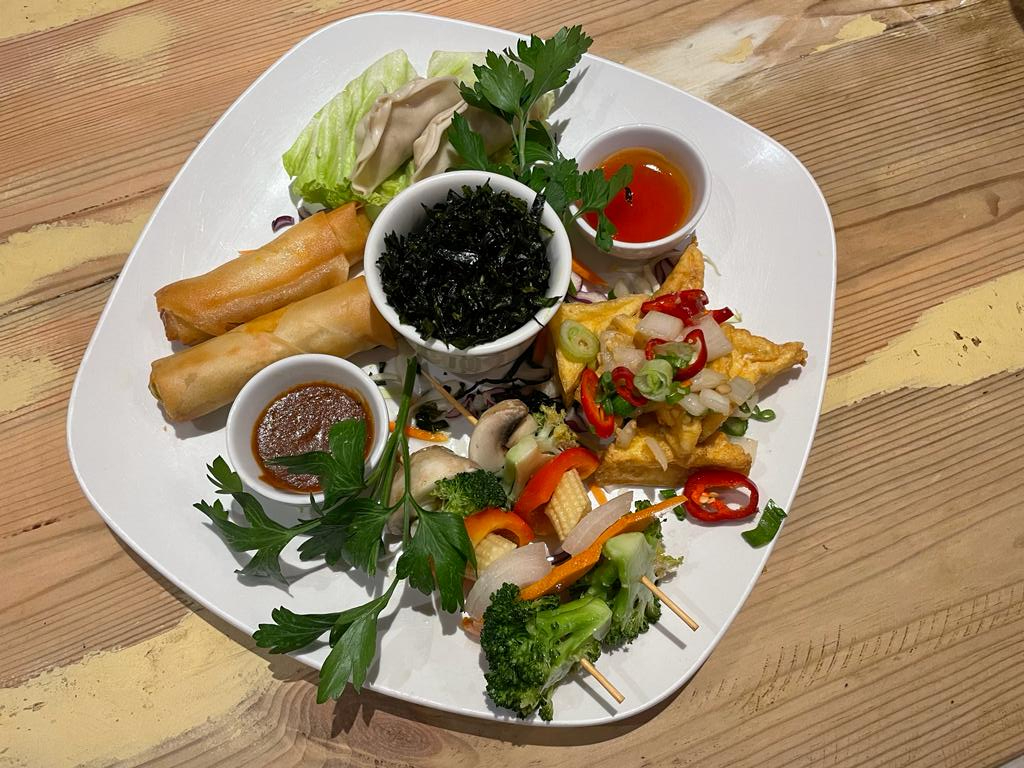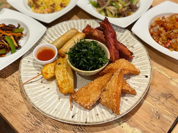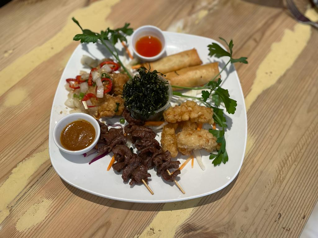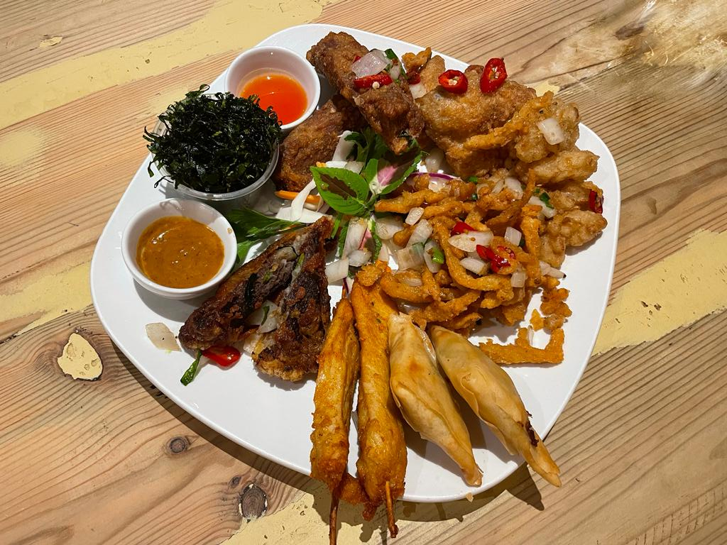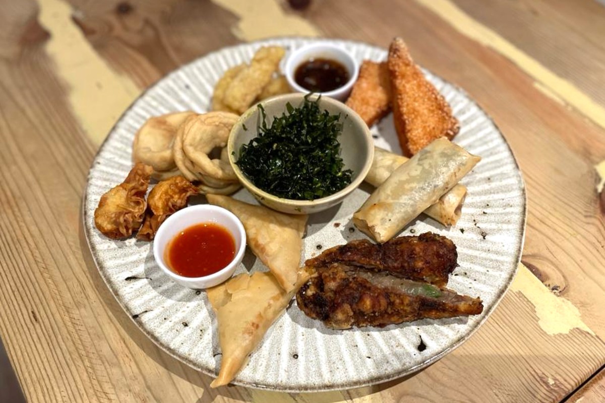 An exquisite assortment of crispy Duck Roll, Lamb Skewer, Deep fried Squid, Salt and Pepper Wings and Seaweed.