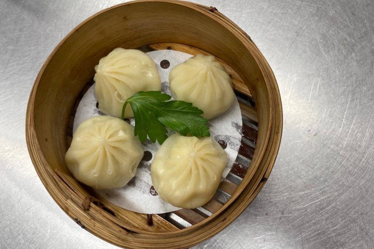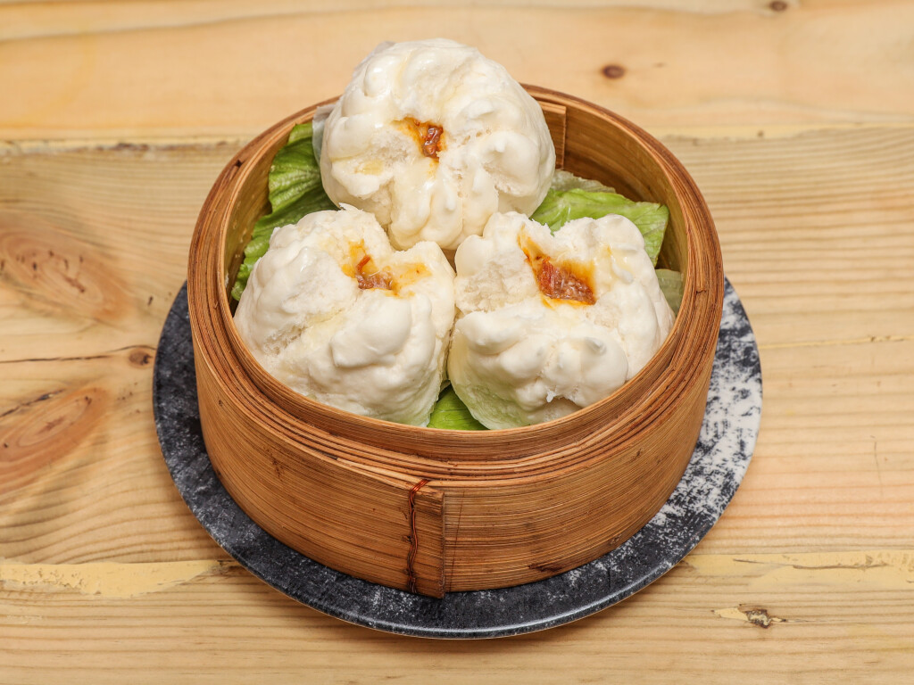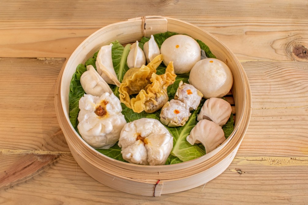 A delightful Dim Sum Box, a tasty mix of small Chinese bites, perfect for sharing. It includes: Har kau, Siu mai, char sui bun, custard bun, beef ginger dumplings, Chicken dumplings, lamb dumplings Served with chilli oil and sweet chilli sauce