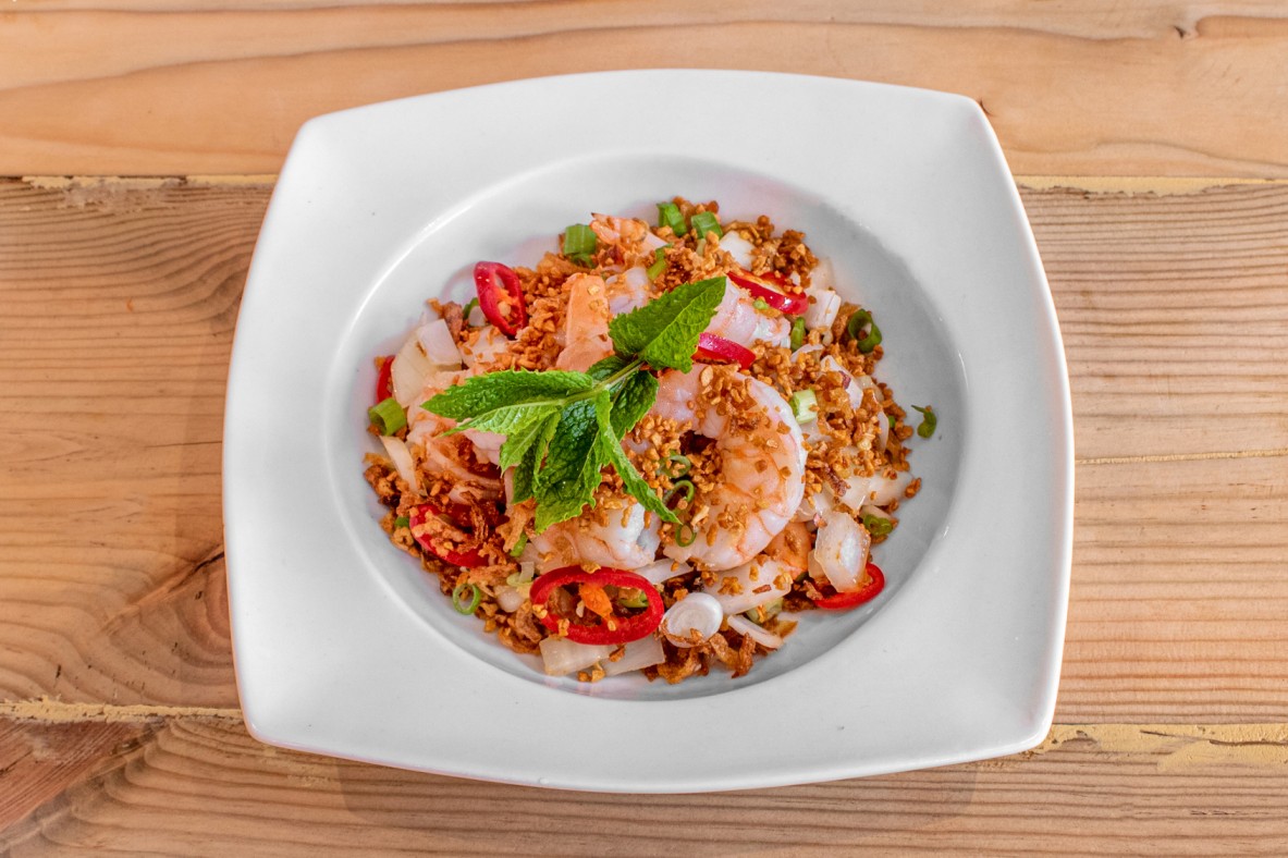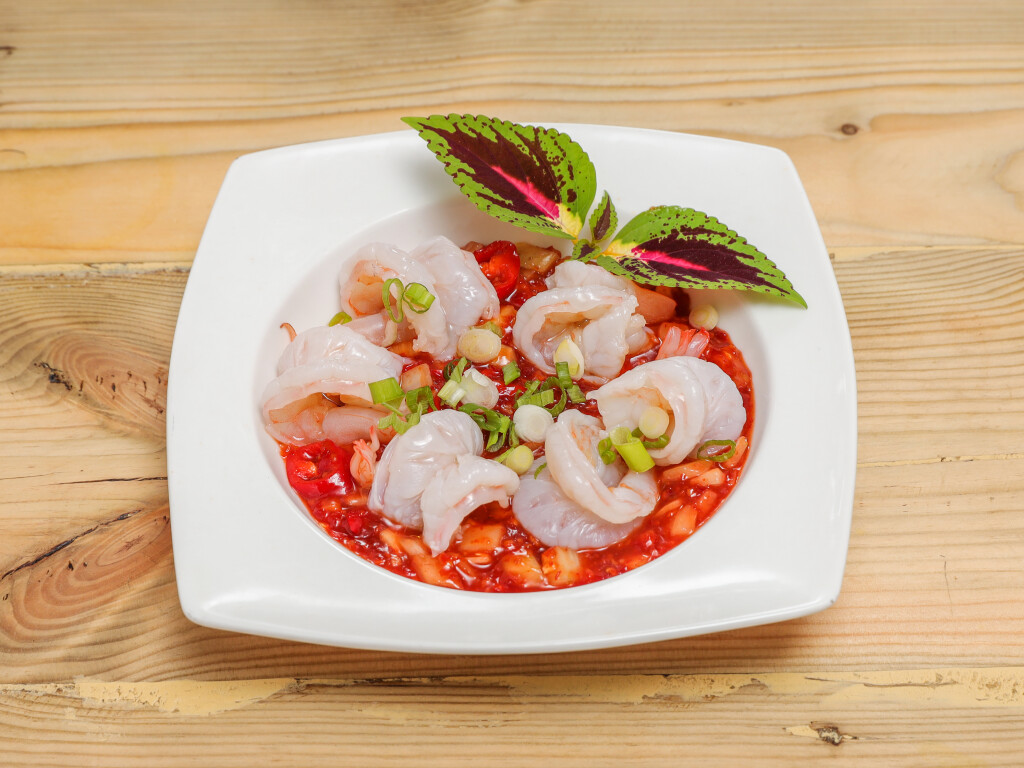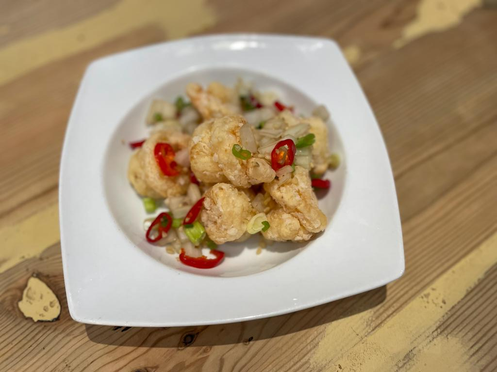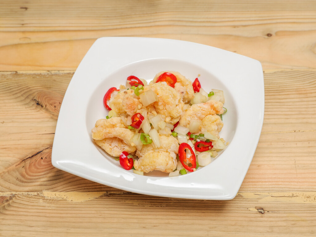 Spicy. Plump, succulent king prawns seasoned with salt and pepper, delivering a savoury and crispy delight.