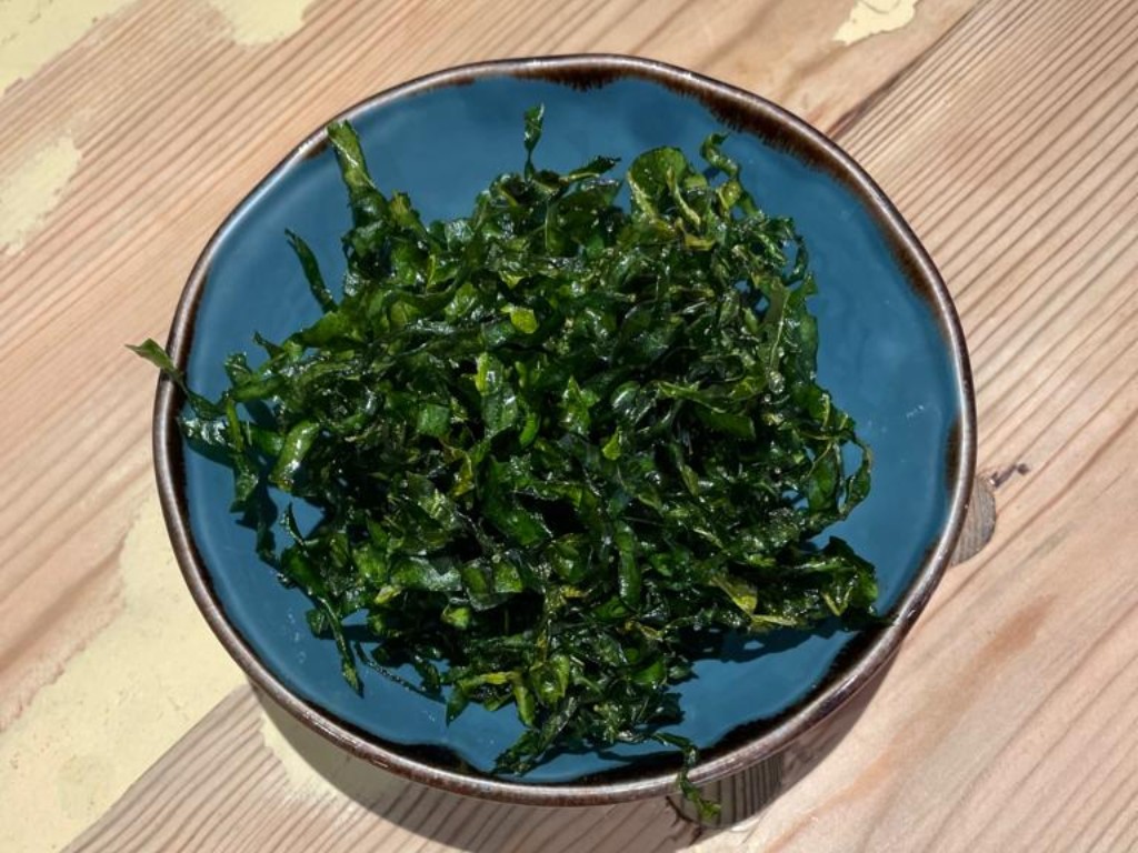 Thin, crunchy strands of seaweed, lightly seasoned and fried to perfection, offering a delightful and savoury snack.