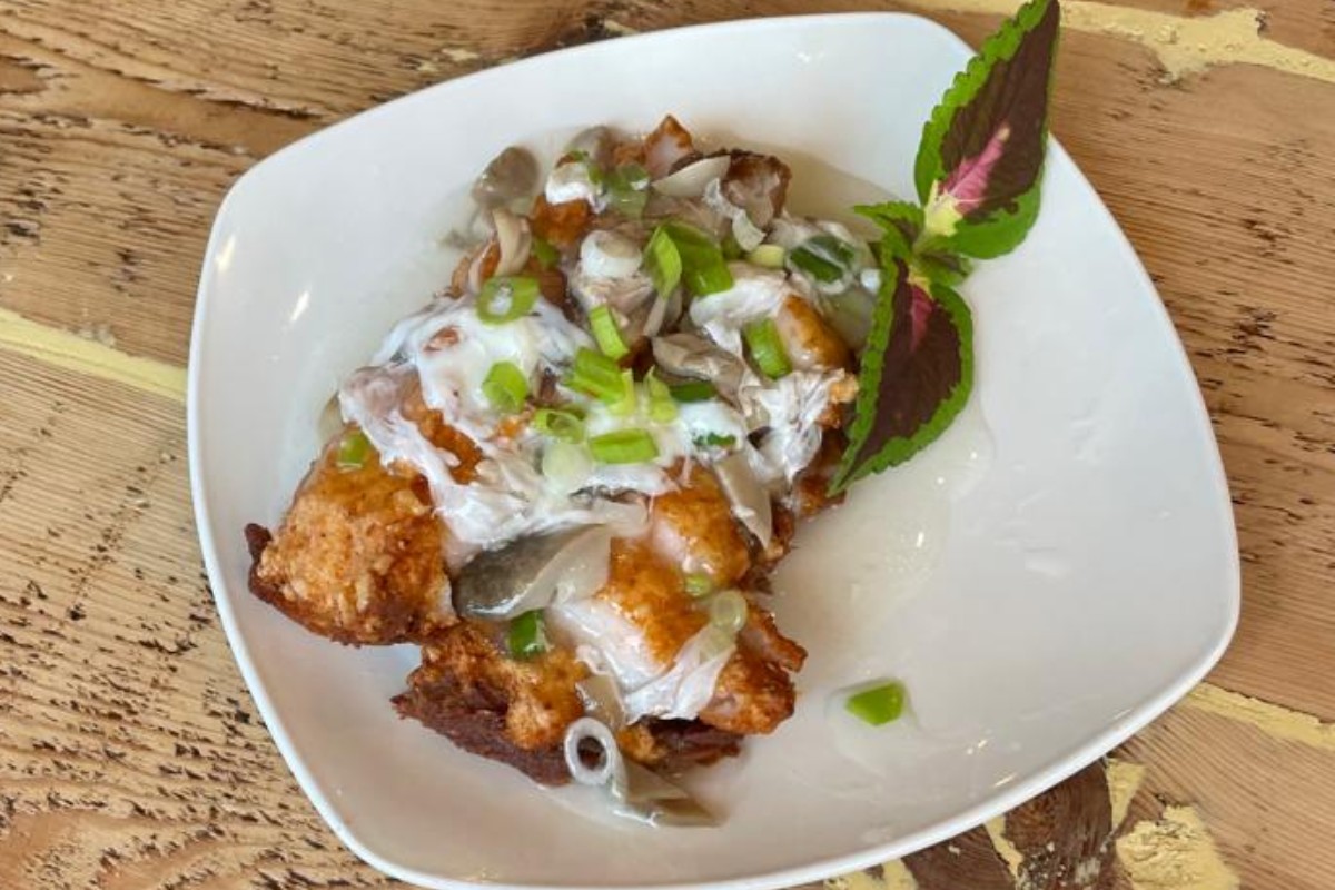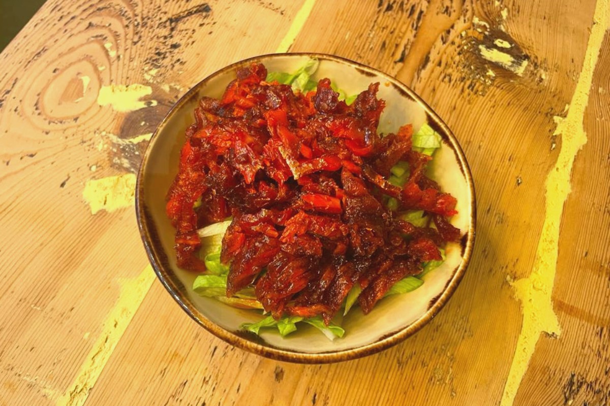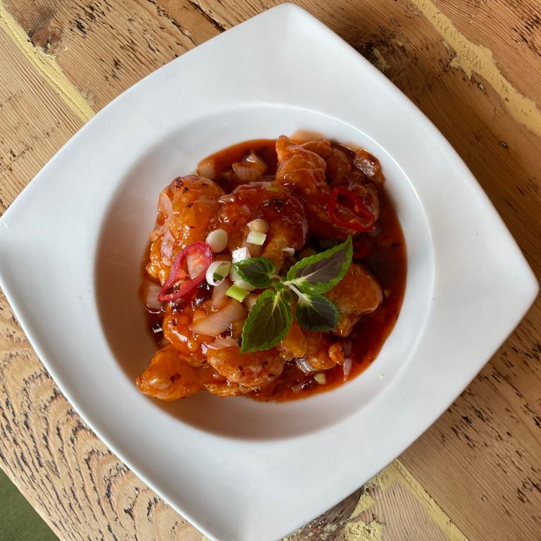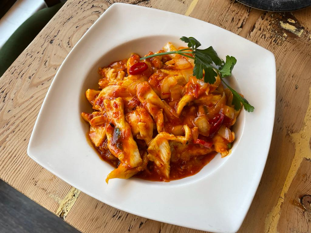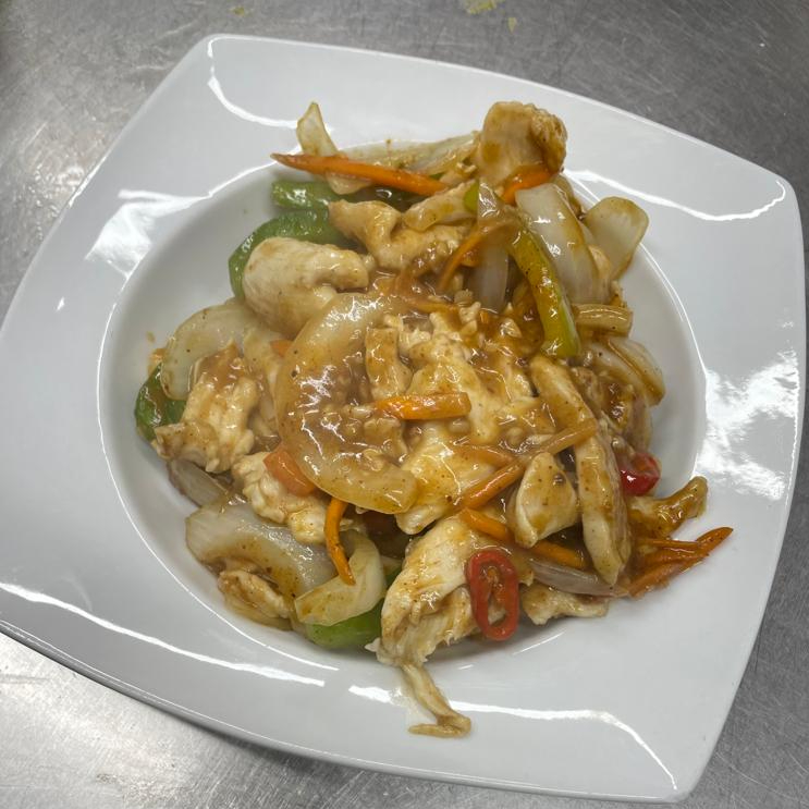 Tender shredded chicken deep-fried in a spicy pepper sauce, delivering a fiery and flavourful dish.