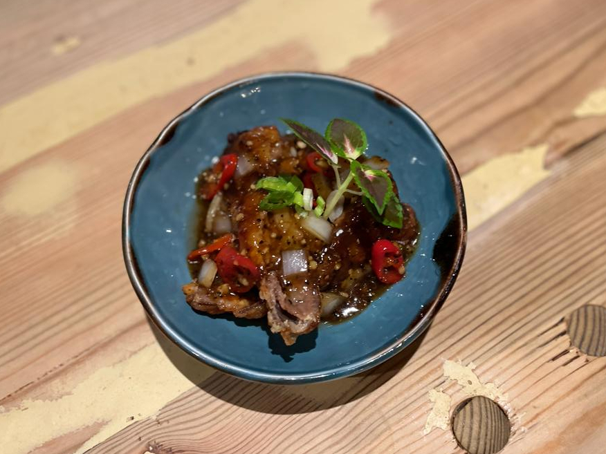 Spicy. Frog legs seasoned with salt and pepper, fried to perfection for a crispy and savoury delicacy.